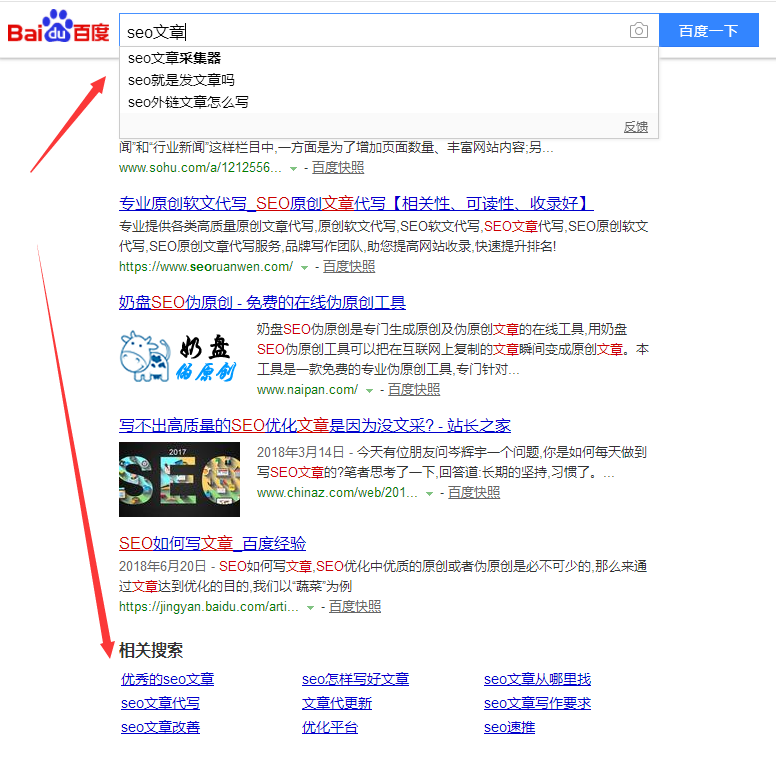 以seo为例,底部推荐中箭头所指的题目都可以作为写作题目。其余的词等类似。