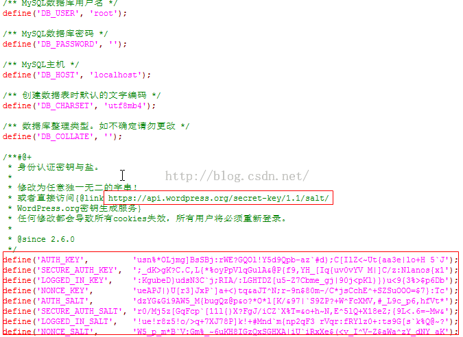 重要设置以下,下面的一长串秘钥能够从网址处直接copy,修正完成保留,称号改成wp-config.php即可。