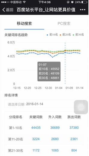 这是点击“症结词”后进入的页面,在这里能够很清晰的看到,本身的网站排在前10、前20、以至前30的症结词个数,固然要注意提醒:以上排名数据仅盘算站点有点击展示的前5万症结词,超越部份不算。那末这是啥意思?简朴说吧,就是长尾词不算呗。而关于上面的升入词数、跌出词数,笔者也特向百度站长社区的着名版主某鹰公理取得了确认,指的是当天的词数与前一天词数的对照,所发生的升入或者是跌出。
