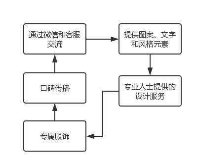 一家做活动衣饰营销的电商,特地开通了DIY活动鞋和T恤衫的效劳,用户能经由历程微信和客服交换,并供应图案、笔墨和作风元素,再取得专业人士供应的设想效劳,末了取得专属衣饰,进而构成口碑流传,如图所示。