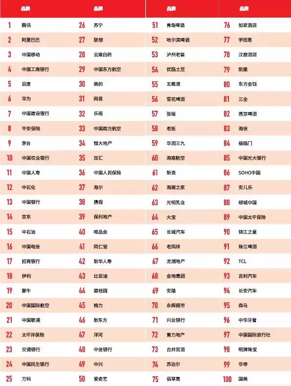 这是我前不久看过《2017最具价值中国品牌100强报告》,我把其中上榜企业的品牌名零丁做了出来,人人能够先看看。