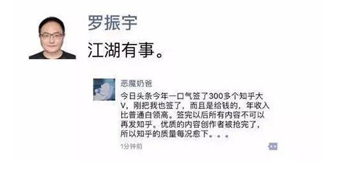 那就是本日头条从知乎平台签下了300个高质量的大V,而且签约费比平常的白领要高,签订的协定中划定这些大V们今后不允许在知乎等问答平台输出学问问答,而且每月要有肯定数目的回覆,有字数的限制。