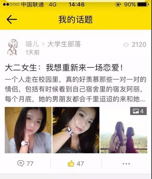方法老是留给有曲线救国头脑的人,一个大二女门生,发了一篇既有分享生活性的帖子,在文中暗示到我想要表达的广告信息。比方:我是一个大二门生,由于本身家庭条件不好,谈了一个男朋侪。