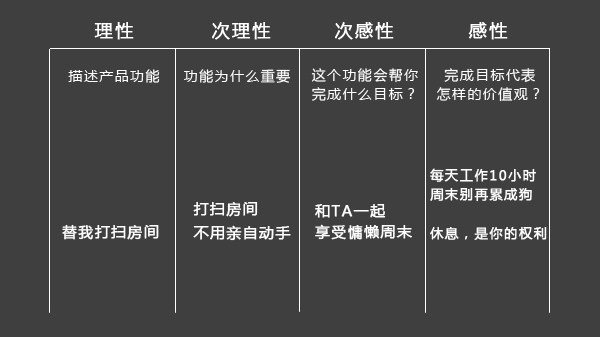 应用“心情推拉”,我们得到了从理性递进到感性的四句案牍。理性案牍彷佛更轻易明白,越发可托,但好像很难唤起效果。感性案牍则恰好相反,更轻易唤起效果,但不轻易被明白,可托度不高。我们究竟应当选哪一句呢?
