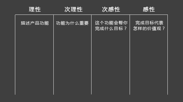 产物功用是什么?为何这个功用主要?这个功用会帮你完成什么目的?完成这个目的代表如何的价值观?(如下图)