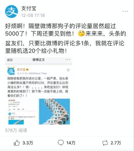 一天前,他在微头条上问候人人放工没,并顺带互动了一下,请刷付出宝坐公交车的头条用户们举个手。微博小编也发了一样的内容。效果,付出宝头条号留言敏捷凌驾了5000条,而付出宝微博的批评却显得冷僻。毕竟,此时付出宝微博具有1200多万粉丝,头条号却只有64万。接下来,根据微博小编的说法,他被老板“蔑视”了一番。随后,微博小编就把“被批”一事公开在微博上,“卖惨”求人人为其增添批评。