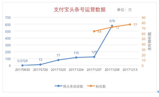 横坐标是付出宝头条号微头条浏览数增进中的几个主要时候点。本年6月30日,付出宝头条号宣告了第一条“微头条”,浏览数还只有729个;7月26日打破10万,12月4日,打破100万;12月28日,由于“付出宝互怼事宜”,当事“微头条”取得578万次暴光,付出宝头条号取得新增粉丝8万,并伴有持续增进,停止发文前,付出宝的头条号已具有82万粉丝。