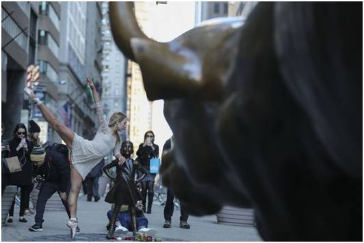2017年“三八国际劳动妇女节”的前一天,一座名为“无畏女孩”(Fearless Girl)的新铜像悄悄矗立在华尔街地标铜牛像正对面。这个女孩双手插腰,抬头直立,面对着铜牛,脚下的牌子上刻着一行字“相识女性的领导气力/她在转变天下”。(Know the power of women in leadership. She makes a difference.)