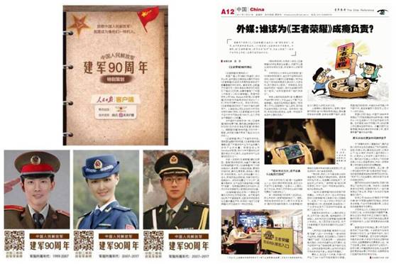 7月,群众日报为庆贺中国群众解放军建军90周年推出《穿上戎衣》营销运动,刷爆了朋友圈;滴滴《此篇笔墨为0》的系列微信文章让人看到了文章立异的可能性。言论层面,除了美团清真事宜外,引发普遍众议的“王者光荣”,包括官媒在内的浩瀚媒体一连多日发声,不仅把以王者光荣为代表的游戏行业推上风口浪尖,也给腾讯带来了庞大的贸易与言论压力。