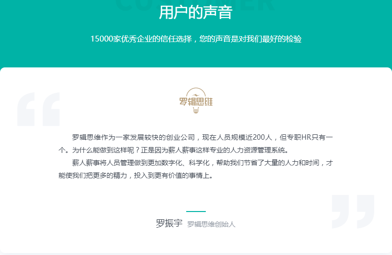 一般,在公司官网或产物手册的末了,B端企业都习气将具有代表性客户的运用体验放出来,一是应用客户的口碑为产物博得信托,另一方面,巧用“KOL”构成自传播效应。比方某互联网SaaS人力资源软件,就将客户罗辑头脑以及自带IP效应的罗振宇的运用体验放在官网,到达为产物背书结果。