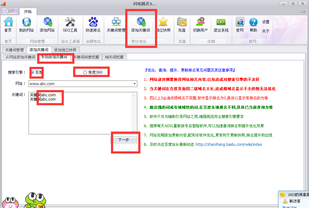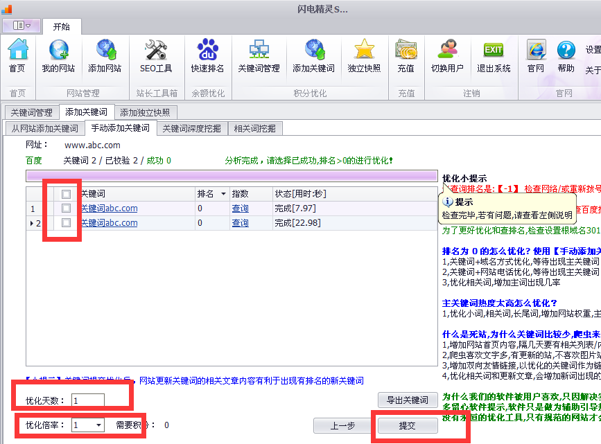 同时有百度和360 你能够依据,你的须要优化的搜索引擎挑选优化。然后输入你须要做的网址和关键词,关键词一行一个。 假如多有多个关键词能够一次输入,这个照样很轻易的