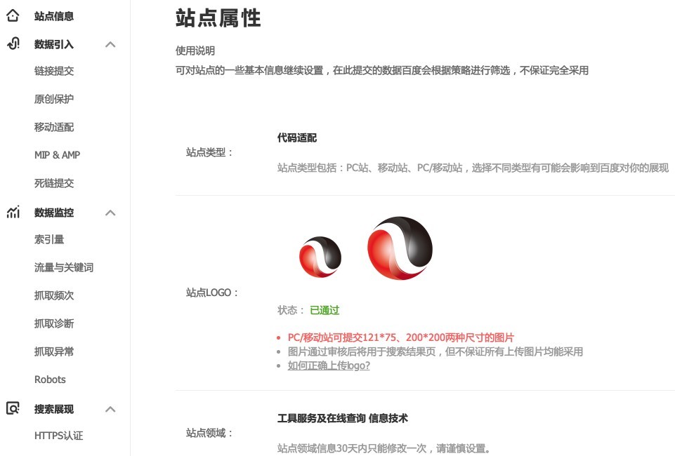 我们以百度为例,上岸百度搜刮资本平台(原站长平台)背景,在搜刮展现——站点属性内里能够看到,优良的网站会自动开通提交站点LOGO的权。