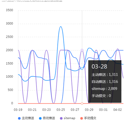 上图是小编在我本身网站站长平台中查询了这么一组数据,主动推送一天有1300篇,自动推送一天有1300篇,网站舆图一天有2000篇,这是三个东西天天推送的一些数据。