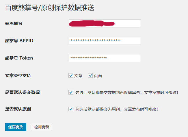 简朴的插件设置页面,只需填写准入密钥Token即可(token填写毛病是没法保留和运用插件的哦,同时token猎取地点也在插件设置页面设置提醒说清楚明了),假如你的站点或许博客基础都是原创文章,那末显而易见你能够勾选这个默许原创的功用,如许你在宣布文章的时刻默许就会主动推送到百度,同时也是能够在宣布文章的时刻设置和勾选是不是是原创而选择性推送。