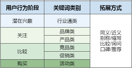 用户消费行动轨迹实际上是从潜伏—关注—比较—购置的历程,我们一一剖析,差别行动阶段对应的关键词种别也不一样,能够从行业通词、品牌词、产物词、竞品词等多个方面去发掘。
