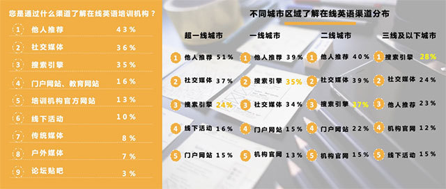别人引荐、社交媒体、搜刮引擎是花费者相识和猎取在线英语培训机构的三大重要渠道,从不同都市地区的渠道散布来看,三线及一下都市对搜刮引擎的依靠水平更高。