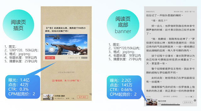 掌阅广告推行情势有开屏、书本概况页、3书本章首、4书本插页、5书本浏览页底部banner这几种,如今推行用度是依据展现而收费的,即展现千次就收取一次的用度,推行用度可控。