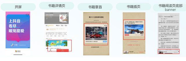 现在掌阅平台主要的广告展示情势有5种,分别为开屏广告、书本详情页广告、书本章首广告、书本插页广告、书本阅读页底部banner广告。广告情势贯串用户阅读全程,轻松满足用户和广告主的两重需求。