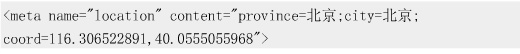 <meta name=”location” content=”province=北京;city=北京;coord=116.306522891,40.0555055968″>