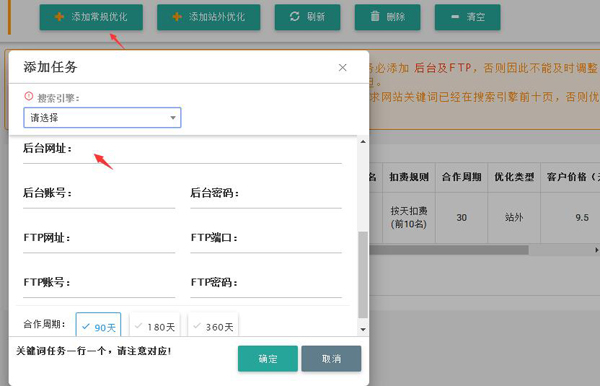2:增加通例优化 通例优化就是正常是SEO优化,合适没有排名或许排名很靠后的网站,优化的时刻会举行站内和站外的优化,所以提交关键词和域名的时刻,必需在背景供应背景账号,背景暗码,FTP网站,FTP端口,FTP账号,FTP暗码,同时也支持站外优化的那些平台百度排名,还能够自定义优化周期30天,60天,90天不等。