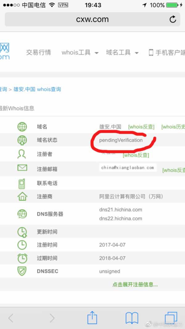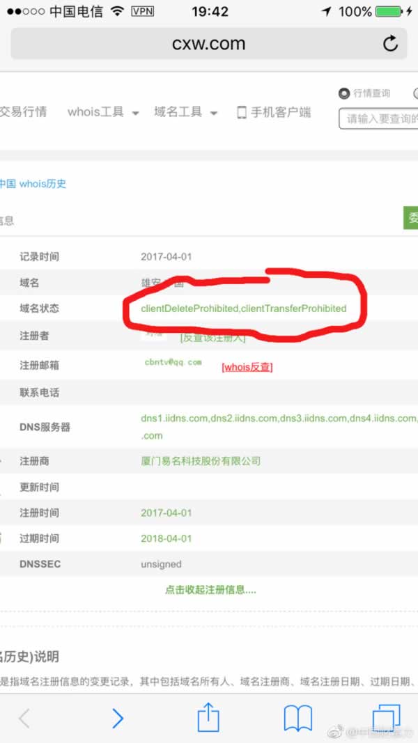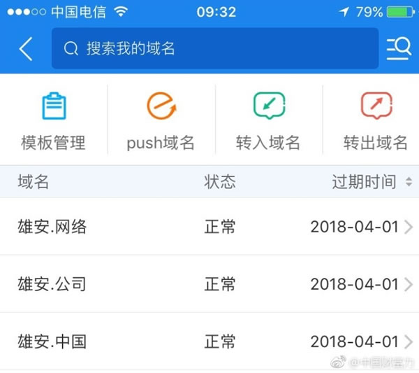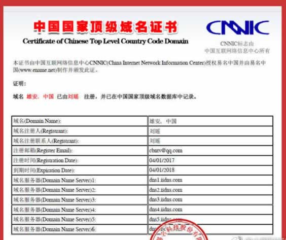 :一网友在易名网注册了“雄安.中国”域名,没做出任何理由就被删除。