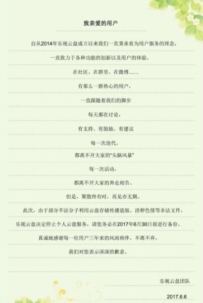 乐视云盘方面称,由于造孽份子利用云盘存储流传盗版、淫秽色情等不法文件,乐视云盘决议阻止小我云盘效劳。
