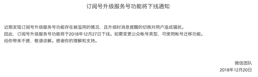 微信团队宣布“定阅号升级效劳号功用将下线照顾”,该功用将于2018年12月27日下线。据悉,微信团队出于近期定阅号升级效劳被滥用,且升级时消息提醒的切换对用户形成骚扰斟酌,做出该决议。现在,微信团队暂未对什么时候恢复做出回应。