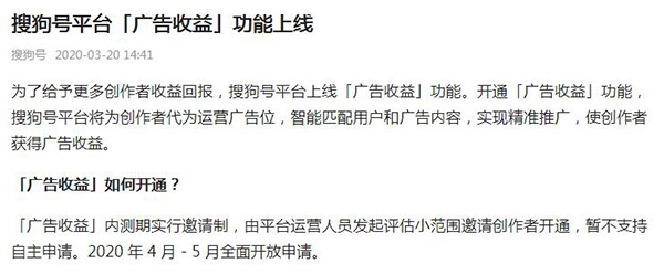 上线两年,近来搜狗号后正式推送上线广告收益功用照顾,今后经由过程搜狗号发文也能取得收益。